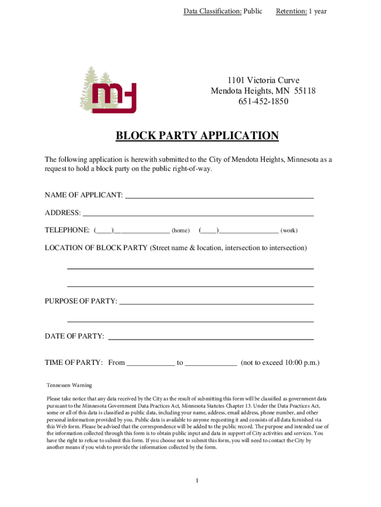 Data Classification: PublicRetention: 1 year1101 Victoria Curve Mendoza Heights, MN 55118 6514521850BLOCK PARTY APPLICATION The following application is herewith submitted to the City of Mendoza Heights,