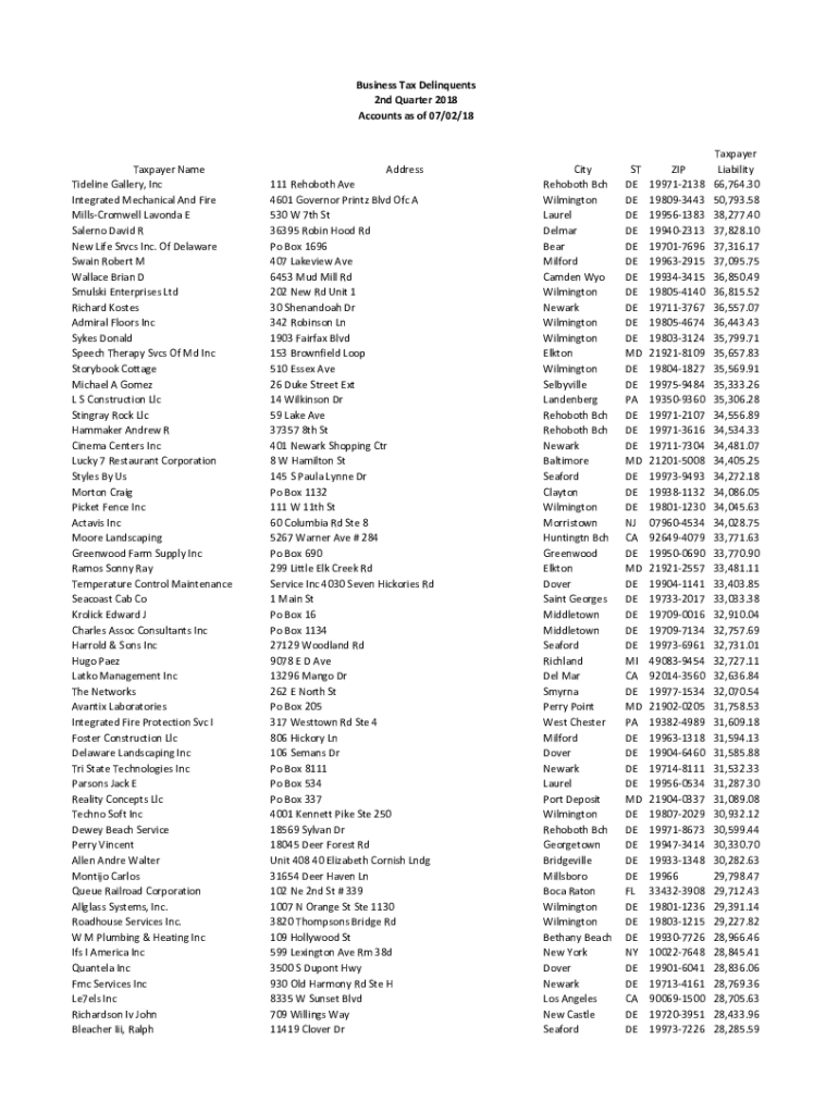 Business Tax Delinquents 2nd Quarter 2018 Accounts as of 07/02/18Taxpayer Name Timeline Gallery, Inc Integrated Mechanical And Fire Mills Cromwell Livonia E Salerno David R New Life Serves Inc. Of