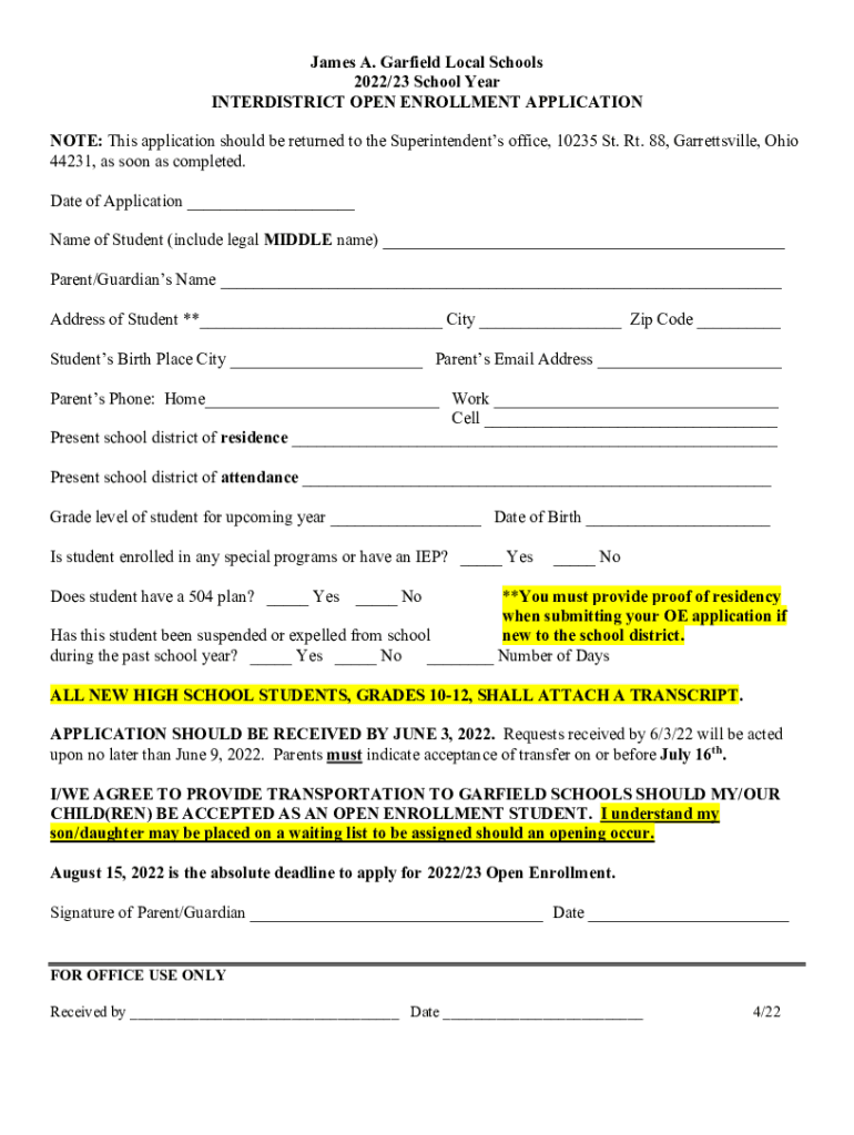 James A. Garfield Local Schools 2022/23 School Year INTERDISTRICT OPEN ENROLLMENT APPLICATION NOTE: This application should be returned to the Superintendents office, 10235 St. Rt. 88, Garrettsville,