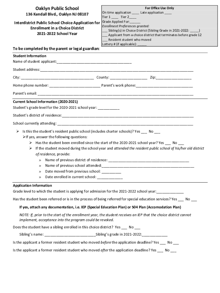 Oakland Public School 136 Kendall Blvd., Oakland NJ 08107 Interdistrict Public School Choice Application for Enrollment in a Choice District 20212022 School Hereford Office Use Only On time application
