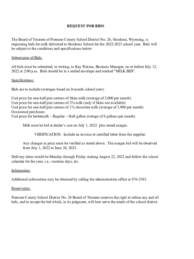 REQUEST FOR BIDS The Board of Trustees of Fremont County School District No. 24, Shoshone, Wyoming, is requesting bids for milk delivered to Shoshone School for the 20222023 school year. Bids will