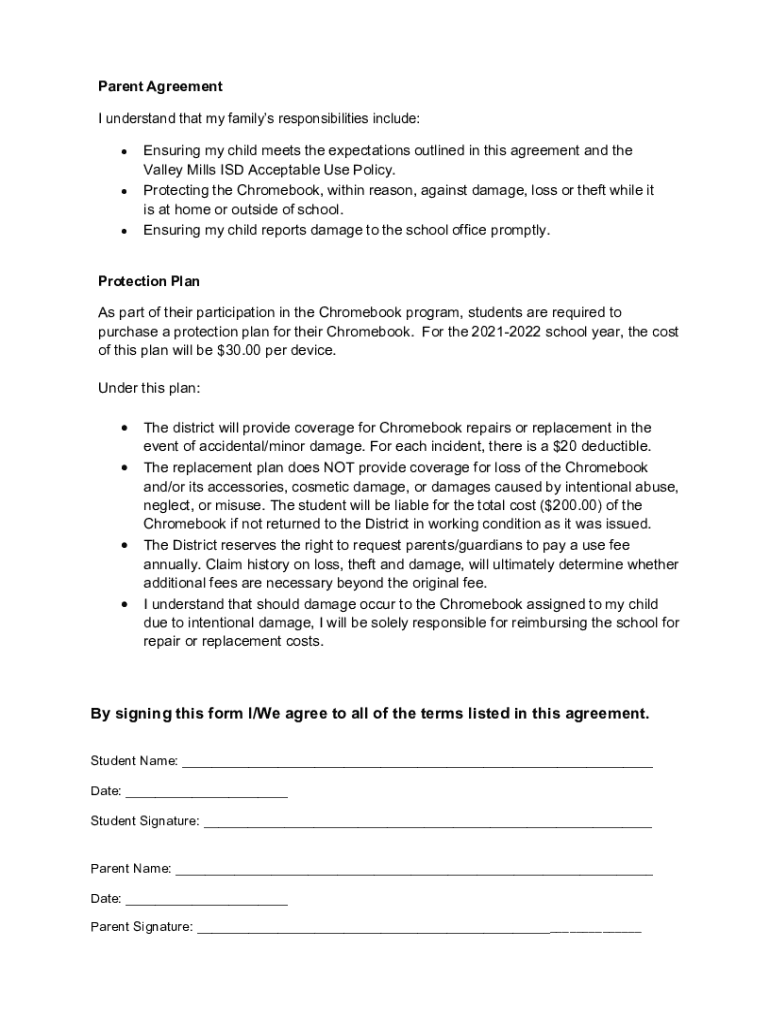 20212022 Valley Mills ISD Chromebook Agreement I acknowledge that we have received the following documents and will ensure that we have read and understood them, in full, prior to my child receiving