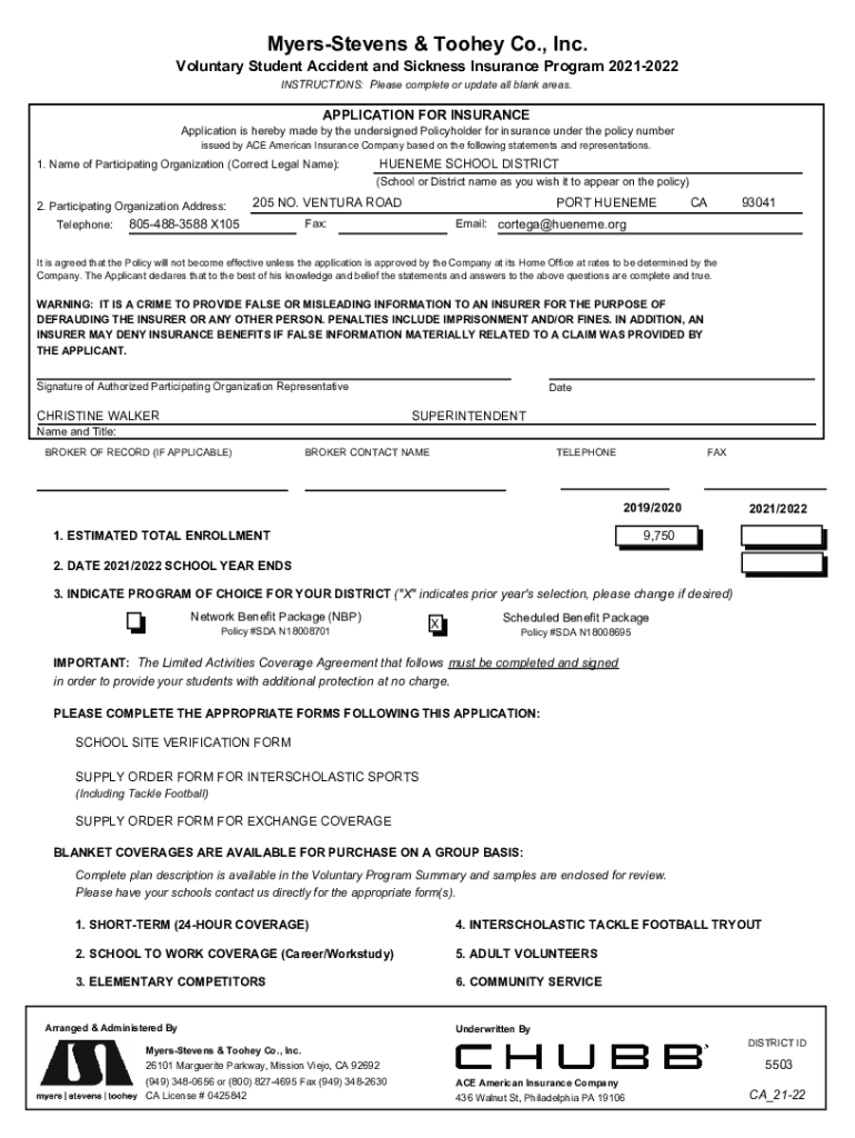 Myers Stevens & Too hey Co., Inc. Voluntary Student Accident and Sickness Insurance Program 20212022 INSTRUCTIONS: Please complete or update all blank areas. APPLICATION FOR INSURANCE Application