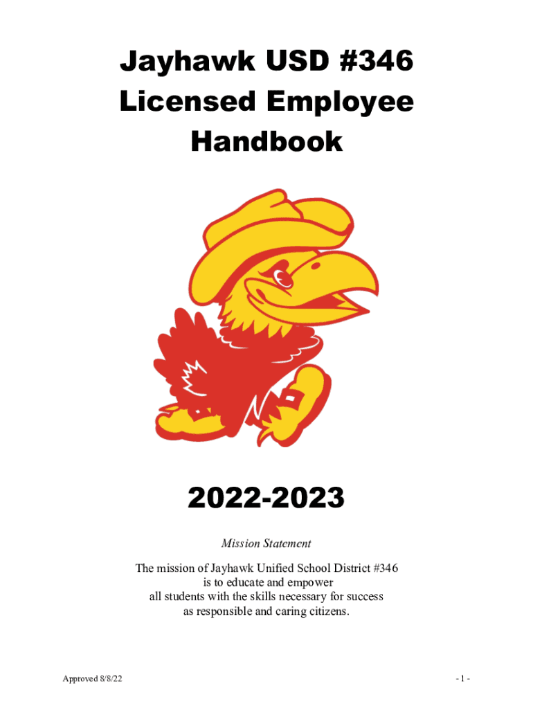 Jayhawk USD #346 Licensed Employee Handbook20222023 Mission Statement The mission of Jayhawk Unified School District #346 is to educate and empower all students with the skills necessary for success