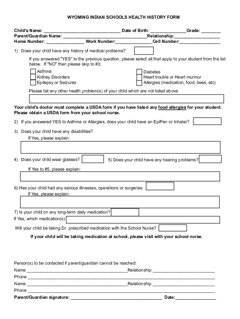 WYOMING INDIAN SCHOOLS HEALTH HISTORY FORM Child's Name: ___ Date of Birth: ___Grade: ___ Parent/Guardian Name: ___Relationship:___ Home Number: ___ Work Number:___ Cell Number:___ 1) Does your child