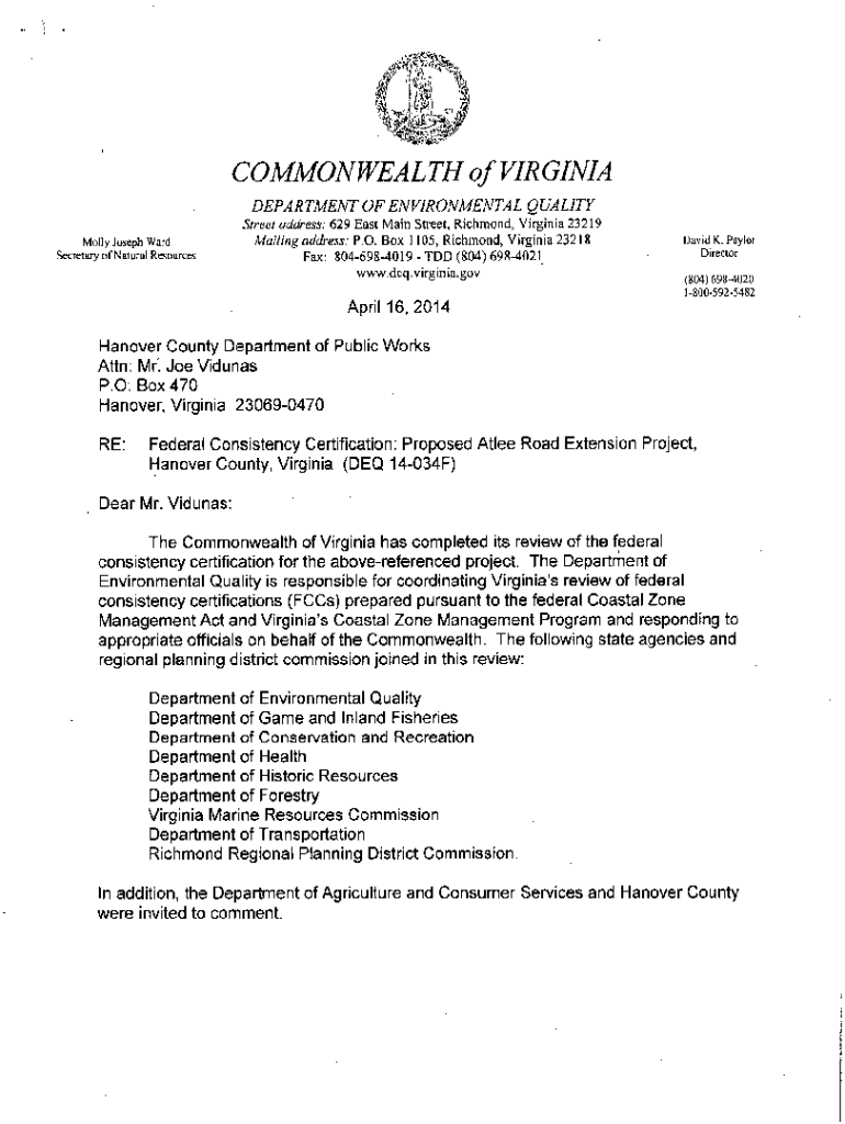 Get the free COMMONWEALTH of VIRGINIA DEPARTMENT of ENVIRONMENTAL QUALITY Street ...