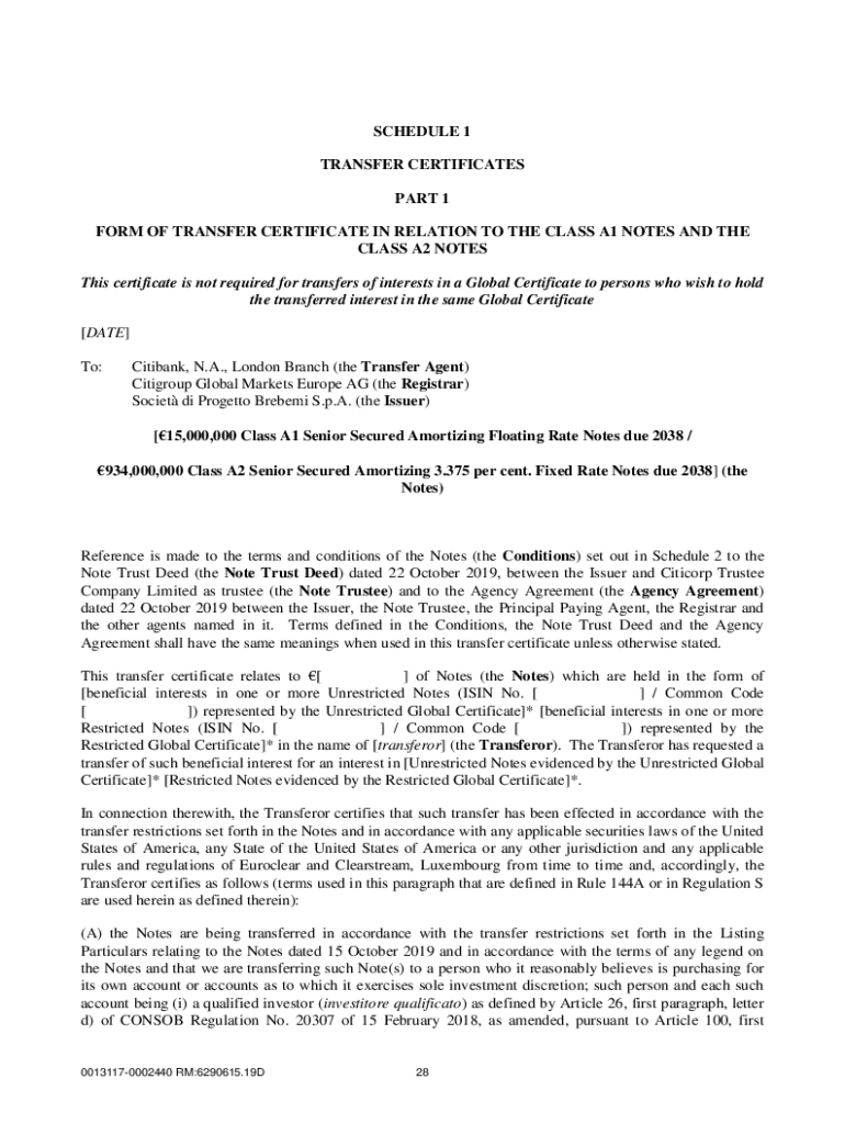 SCHEDULE 1 TRANSFER CERTIFICATES PART 1 FORM OF TRANSFER CERTIFICATE IN RELATION TO THE CLASS A1 NOTES AND THE CLASS A2 NOTES This certificate is not required for transfers of interests in a Global