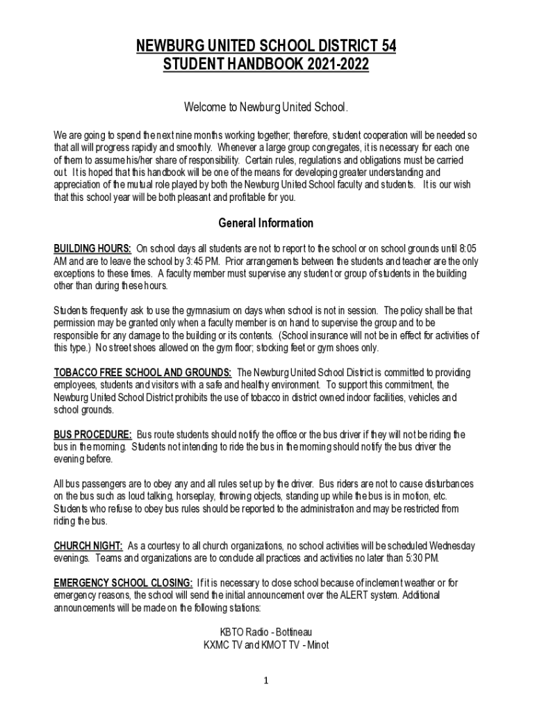 NEWBURGH UNITED SCHOOL DISTRICT 54 STUDENT HANDBOOK 20212022 Welcome to Newburgh United School. We are going to spend the next nine months working together; therefore, student cooperation will be