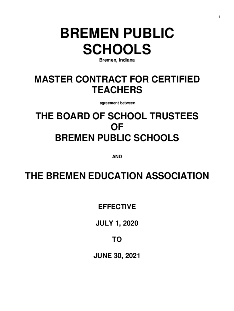 1BREMEN PUBLIC SCHOOLS Bremen, IndianaMASTER CONTRACT FOR CERTIFIED TEACHERS agreement between BOARD OF SCHOOL TRUSTEES OF BREMEN PUBLIC SCHOOLS ANOTHER BREMEN EDUCATION ASSOCIATION EFFECTIVE JULY