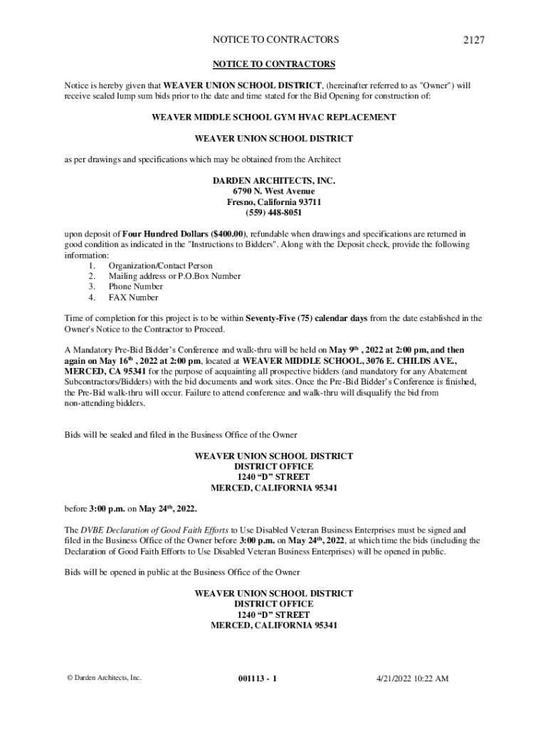 NOTICE TO CONTRACTORS2127NOTICE TO CONTRACTORS Notice is hereby given that WEAVER UNION SCHOOL DISTRICT, (hereinafter referred to as \” Owner\”) will receive sealed lump sum bids prior to the