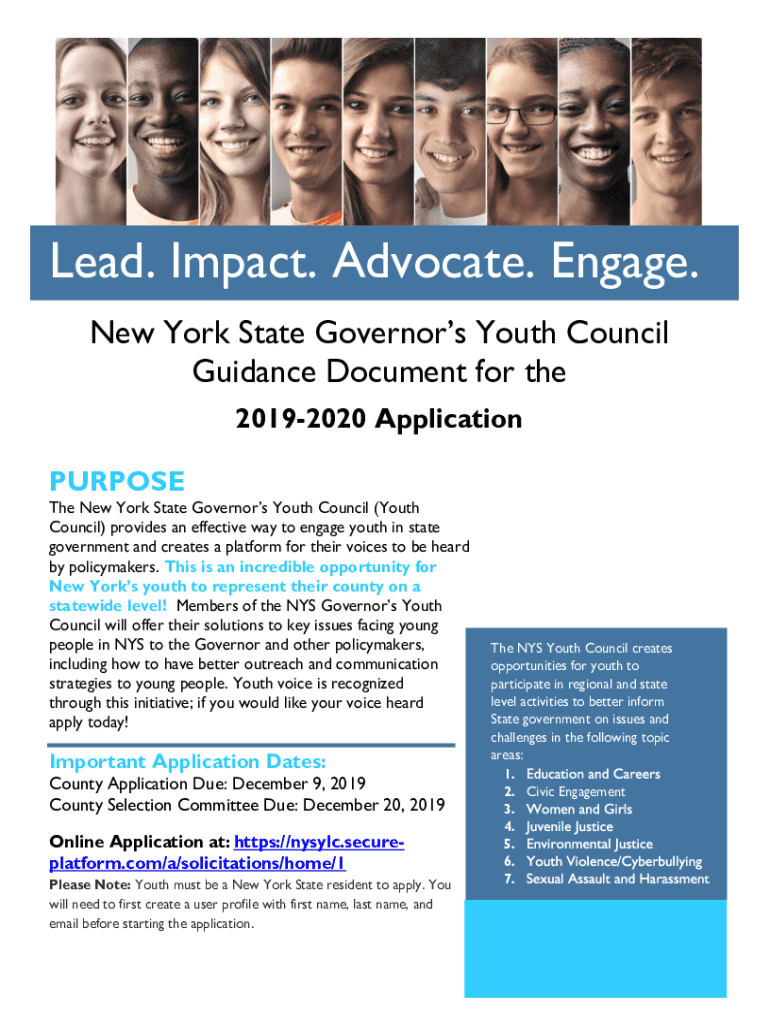 Lead. Impact. Advocate. Engage. New York State Governors Youth Council Guidance Document for the 20192020 Application PURPOSE The New York State Governors Youth Council (Youth Council) provides an