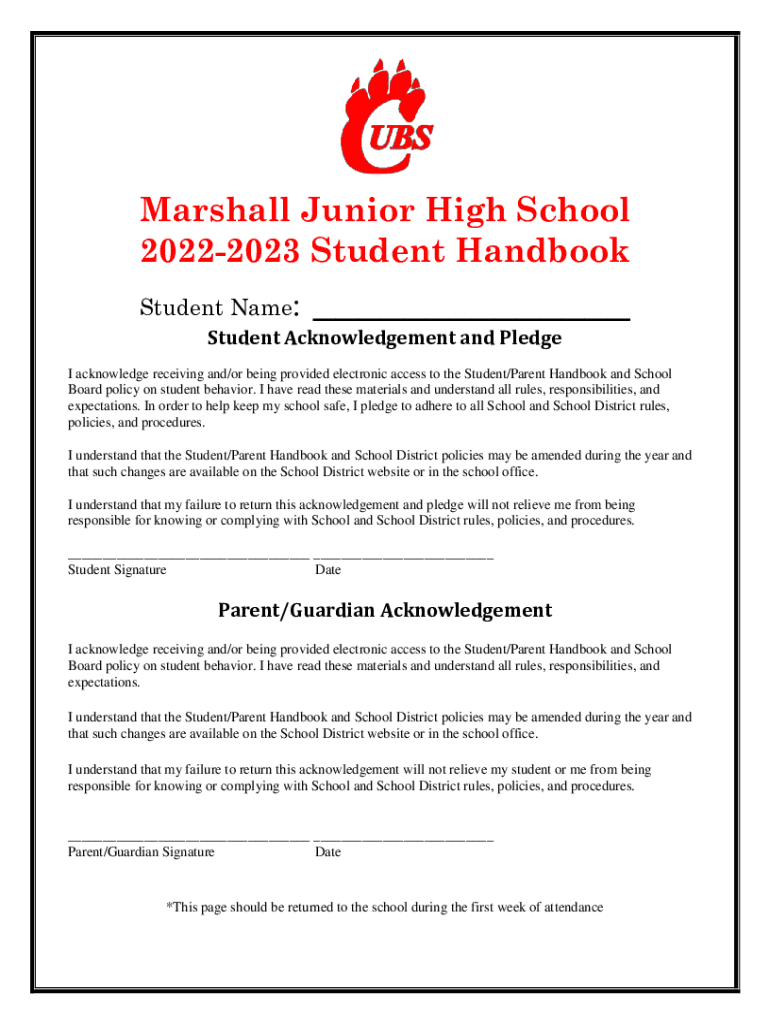Marshall Junior High School 20222023 Student Handbook Student Name:___Student Acknowledgement and Pledge I acknowledge receiving and/or being provided electronic access to the Student/Parent Handbook