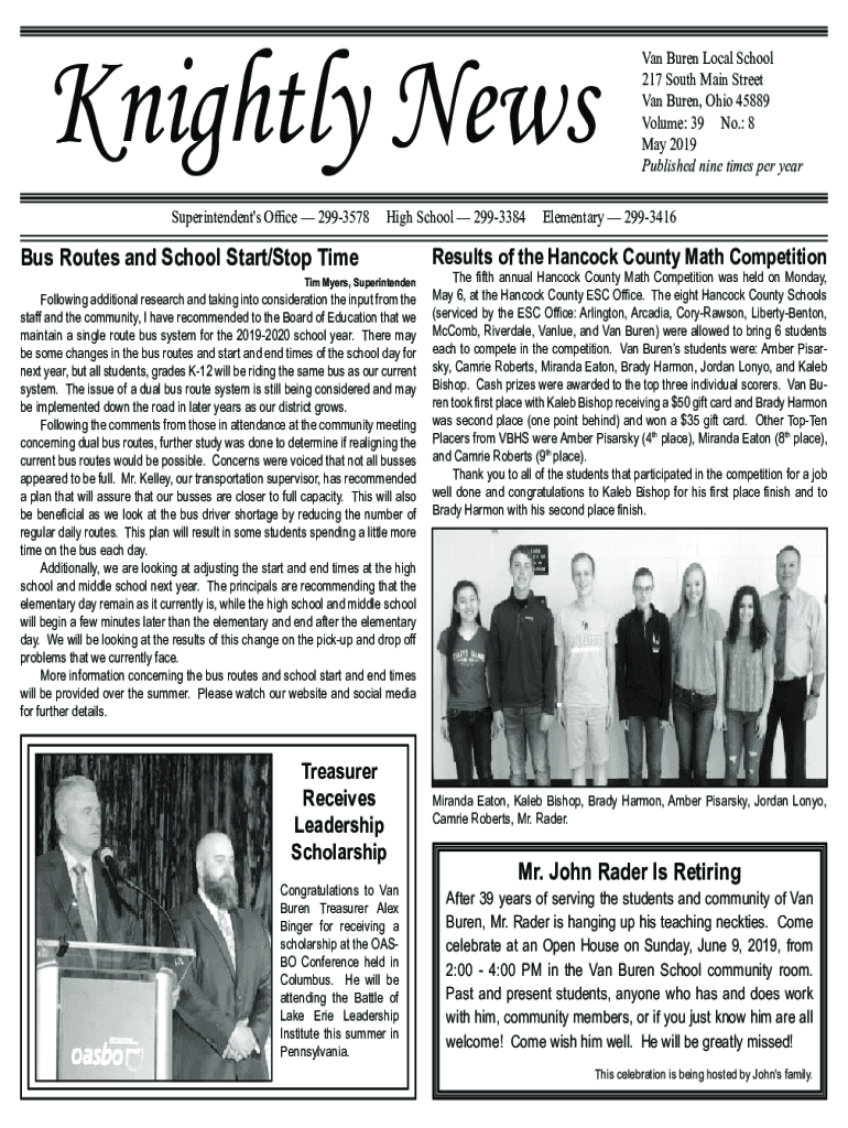 Knightly News Superintendent\'s Office 2993578High School 2993384Bus Routes and School Start/Stop Time Tim Myers, SuperintendenFollowing additional research and taking into consideration the input