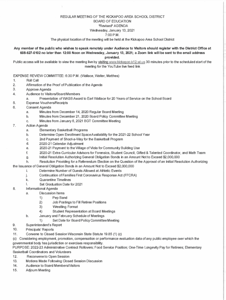 REGULAR MEETING OF THE KICKAPOO AREA SCHOOL DISTRICT BOARD OF EDUCATION *Revised* AGENDA Wednesday, January 13, 2021 7:00 P.M. The physical location of the meeting will be held at the Kickapoo Area
