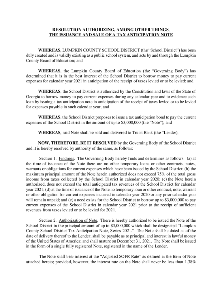 RESOLUTION AUTHORIZING, AMONG OTHER THINGS, THE ISSUANCE AND SALE OF A TAX ANTICIPATION NOTE WHEREAS, LUMPKIN COUNTY SCHOOL DISTRICT (the School District) has been duly created and is validly existing