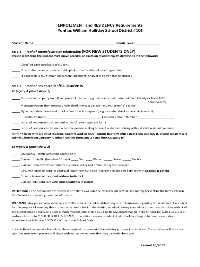 ENROLLMENT and RESIDENCY Requirements Pontiac William Holiday School District #105 Student Name:___ Grade Level: ___ Step 1 Proof of parent/guardian relationship (FORMER STUDENTS ONLY)Person registering