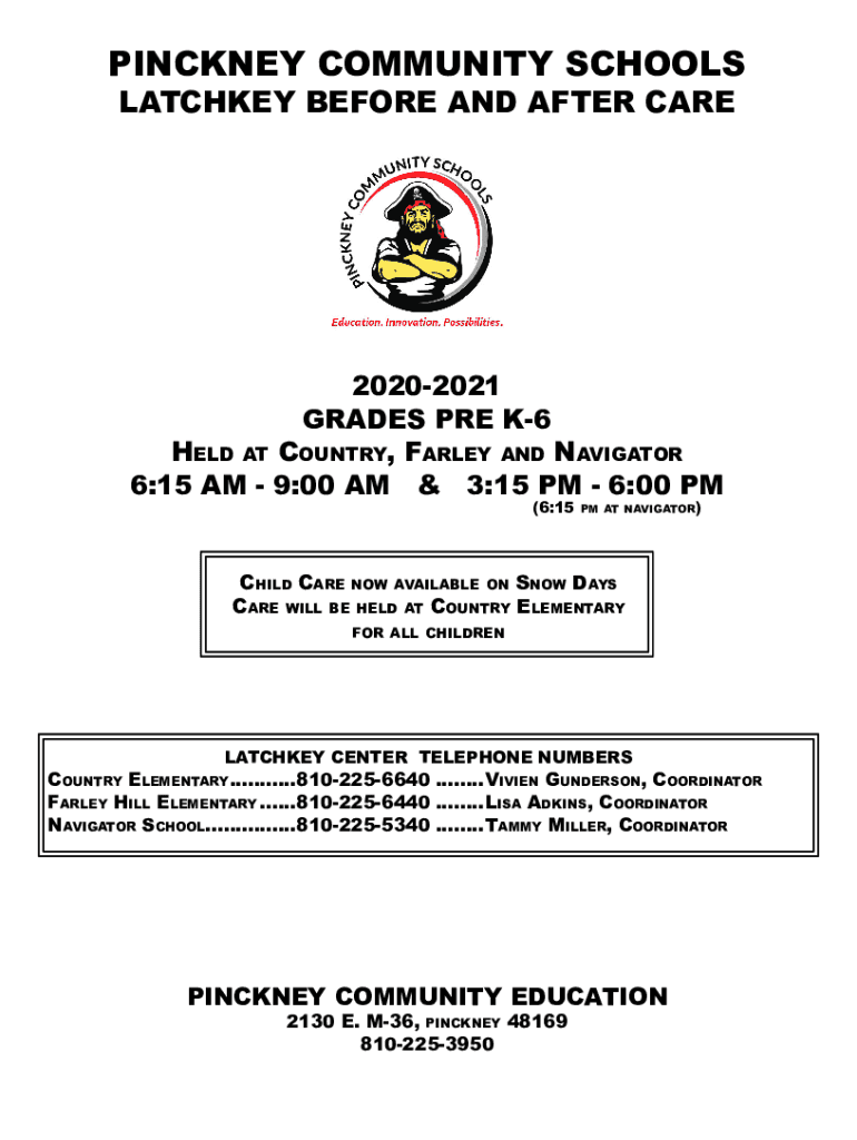 PINCKNEY COMMUNITY SCHOOLS LATCHKEY BEFORE AND AFTER CARE20202021 GRADES PRE K6 HELD AT COUNTRY, FARLEY AND NAVIGATOR 6:15 AM 9:00 AM & 3:15 PM 6:00 PM (6:15PM AT NAVIGATOR)CHILD CARE NOW AVAILABLE