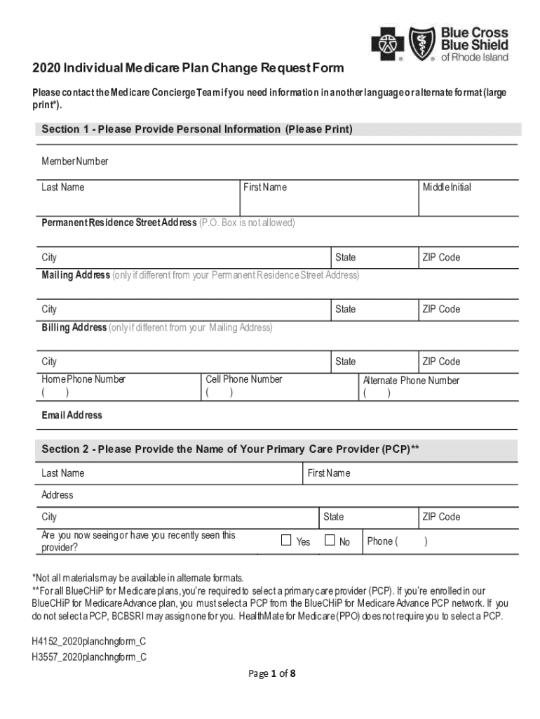 Get the free 2020 Individual Medicare Plan Change Request Form