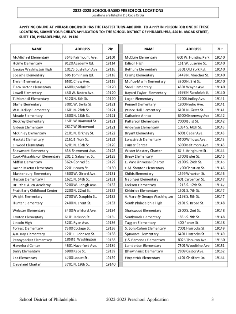 20222023 SCHOOLED PRESCHOOL LOCATIONS are listed in Zip Code Reapplying ONLINE AT PHILASD.ORG/PREK HAS THE FASTEST TURNAROUND. TO APPLY IN PERSON FOR ONE OF THESE LOCATIONS, SUBMIT YOUR CHILD\'S APPLICATION