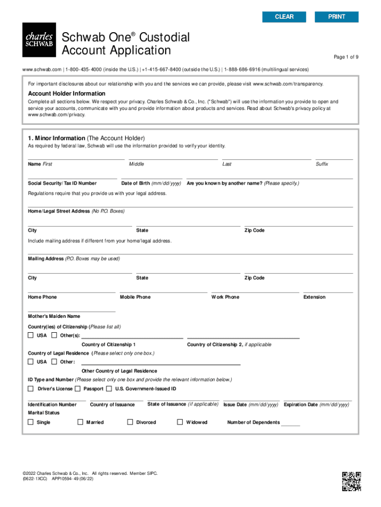 CLEARPRINTSchwab One Custodial Account Application Page 1 of 9www.schwab.com | 18004354000 (inside the U.S.) | +14156678400 (outside the U.S.) | 18886866916 (multilingual services) For important disclosures