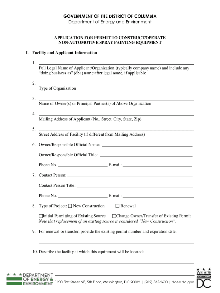 GOVERNMENT OF THE DISTRICT OF COLUMBIA Department of Energy and EnvironmentAPPLICATION FOR PERMIT Constructing/OPERATE NONAUTOMOTIVE SPRAY PAINTING EQUIPMENT. Facility and Applicant Information 1.