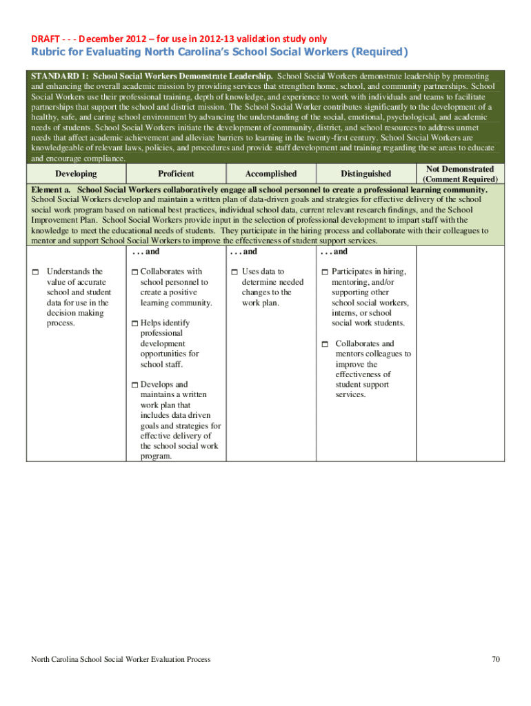 DRAFT December 2012 for use in 201213 validation study only Rubric for Evaluating North Carolina's School Social Workers (Required) STANDARD 1: School Social Workers Demonstrate Leadership. School