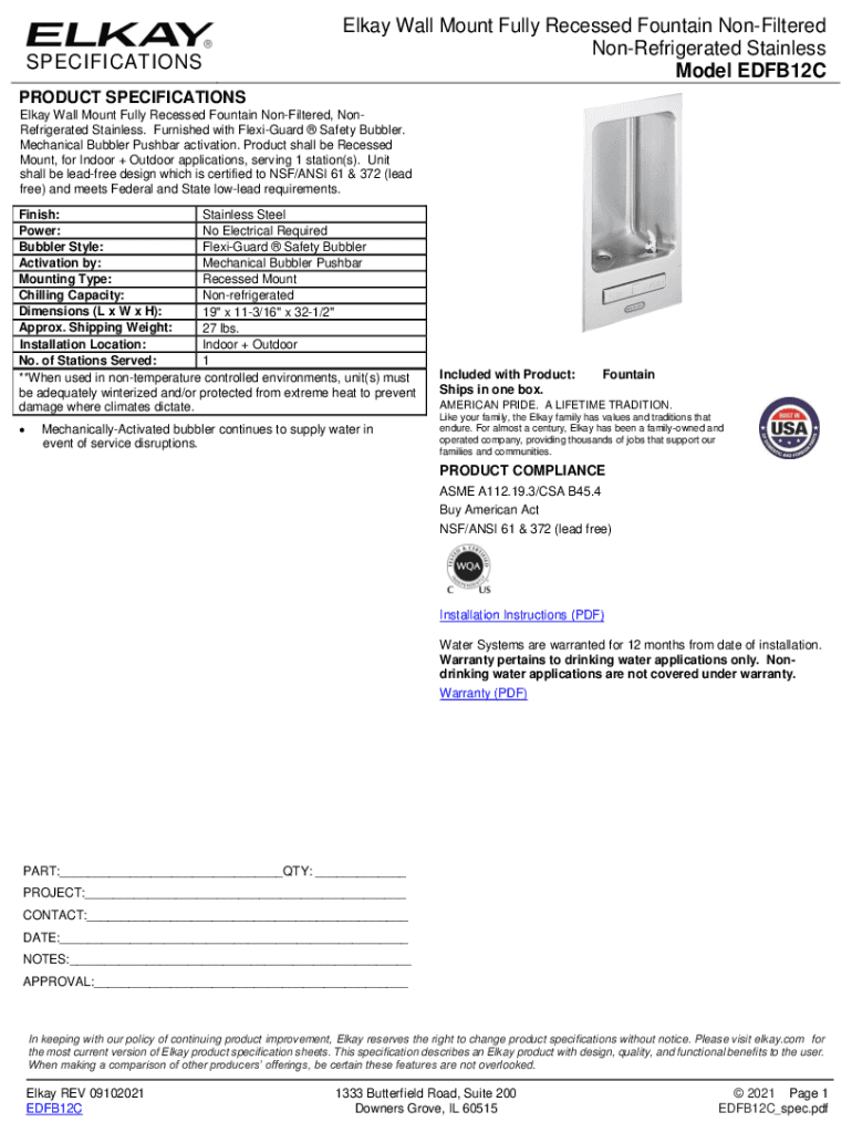 SPECIFICATIONSElkay Wall Mount Fully Recessed Fountain Unfiltered Unrefrigerated Stainless Model EDFB12CPRODUCT SPECIFICATIONS Elway Wall Mount Fully Recessed Fountain Unfiltered, Unrefrigerated Stainless.
