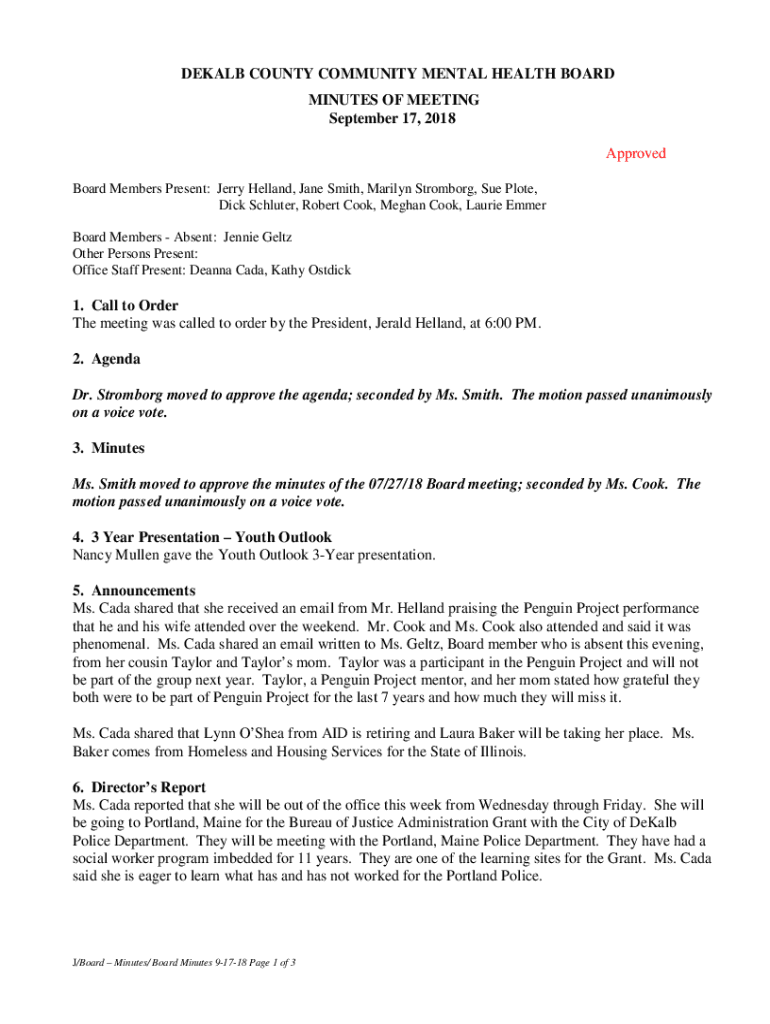 DEKALB COUNTY COMMUNITY MENTAL HEALTH BOARD MINUTES OF MEETING September 17, 2018, Approved Board Members Present: Jerry Holland, Jane Smith, Marilyn Stromboli, Sue Plot, Dick Scouter, Robert Cook,