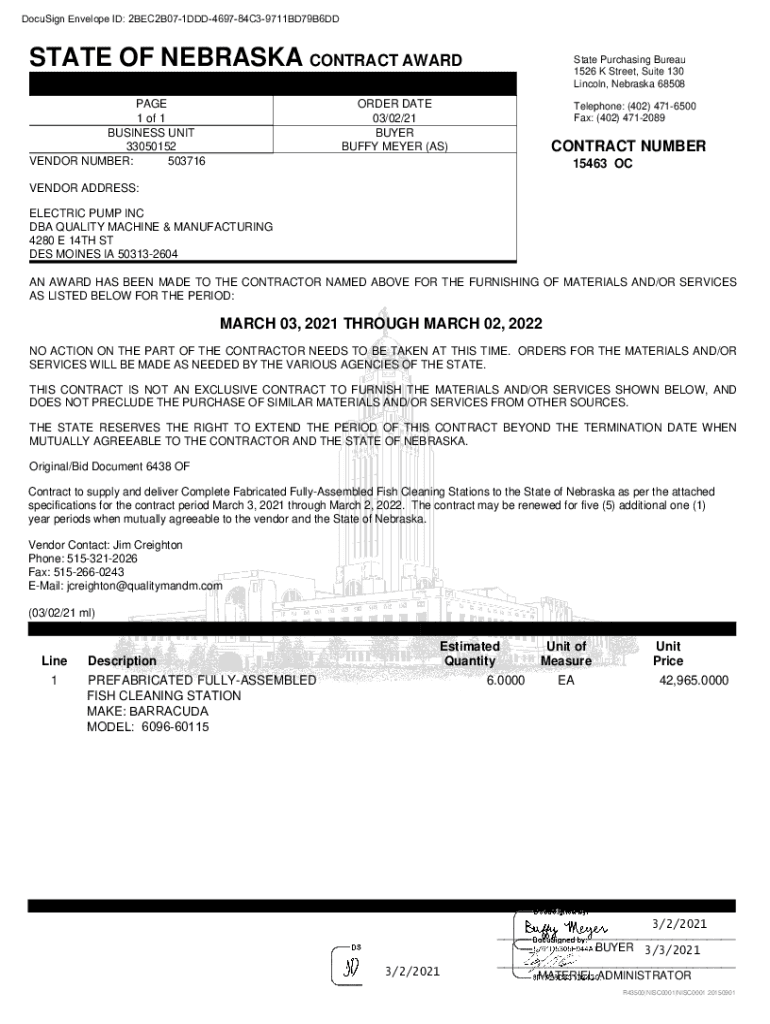 DocuSign Envelope ID: 2BEC2B071DDD469784C39711BD79B6DDSTATE OF NEBRASKA CONTRACT AWARD PAGE 1 of 1 BUSINESS UNIT 33050152 VENDOR NUMBER: 503716State Purchasing Bureau 1526 K Street, Suite 130 Lincoln,