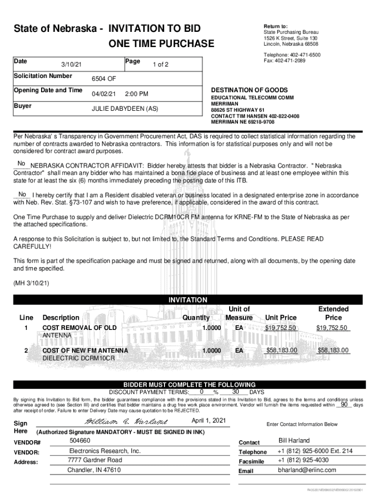 Get the free State of Nebraska ITB 6504 OF Electronics Research, Inc. Response. KRNE-FM Antenna a...