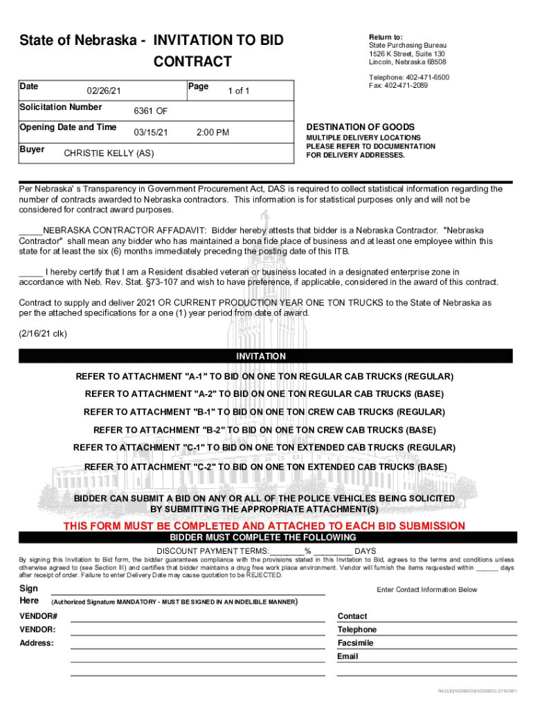 State of Nebraska INVITATION TO Return to: State Purchasing Bureau 1526 K Street, Suite 130 Lincoln, Nebraska 68508CONTRACT DatePage02/26/21Solicitation Number6361 Opening Date and Time03/15/21BuyerTelephone:
