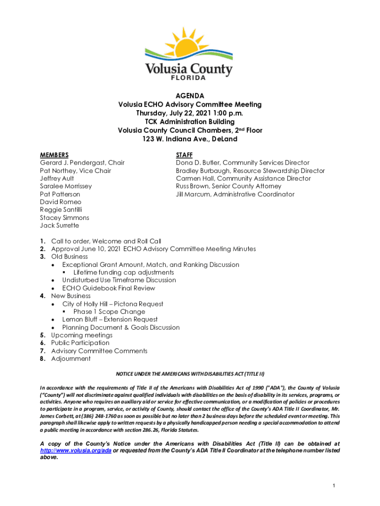 AGENDA Völuspá ECHO Advisory Committee Meeting Thursday, July 22, 2021 1:00 p.m. TCK Administration Building Volusia County Council Chambers, 2nd Floor 123 W. Indiana Ave., Demand MEMBERS Gerard