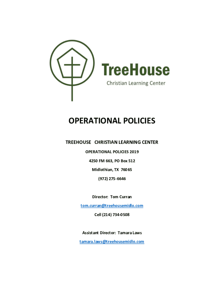 OPERATIONAL POLICIES TREEHOUSE CHRISTIAN LEARNING CENTER OPERATIONAL POLICIES 2019 4250 FM 663, PO Box 512 Midlothian, TX 76065 (972) 2756646Director: Tom Currant tom.curran@treehousemidlo.com Cell