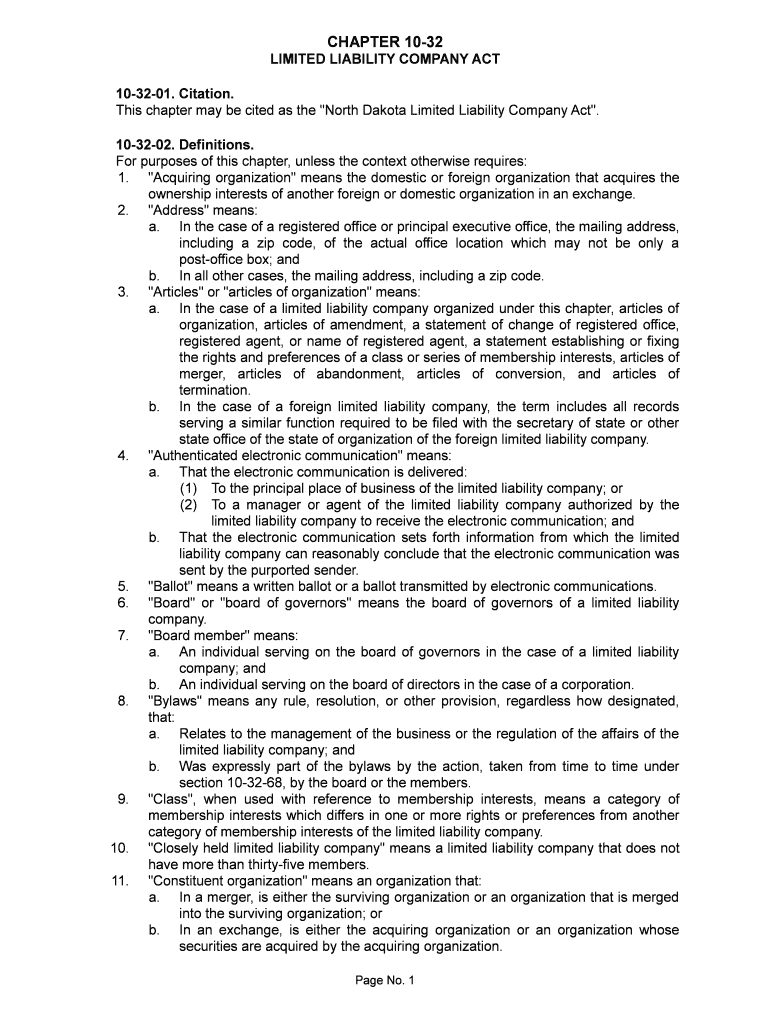 This chapter outlines the provisions and regulations for the formation, operation, and dissolution of limited liability companies in North Dakota. It includes definitions, governance structures, duties