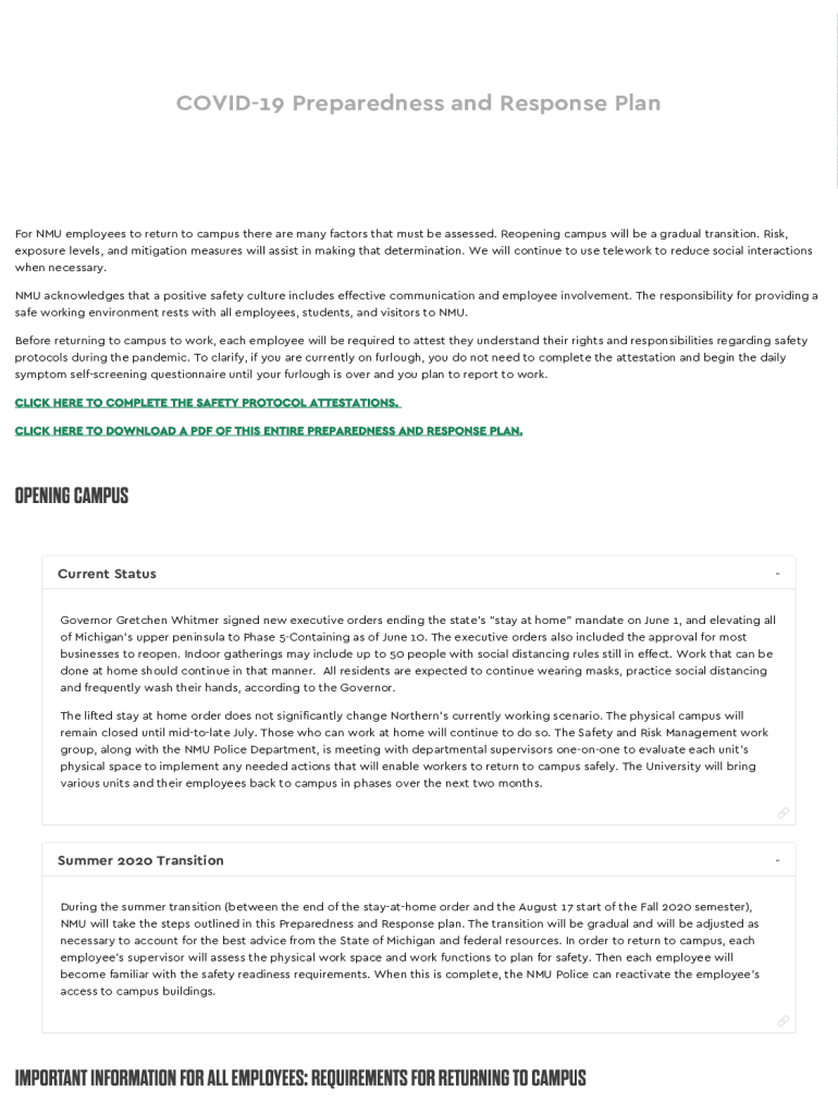 COVID-19 Preparedness and Response Platform NMR employees to return to campus there are many factors that must be assessed. Reopening campus will be a gradual transition. Risk, exposure levels, and