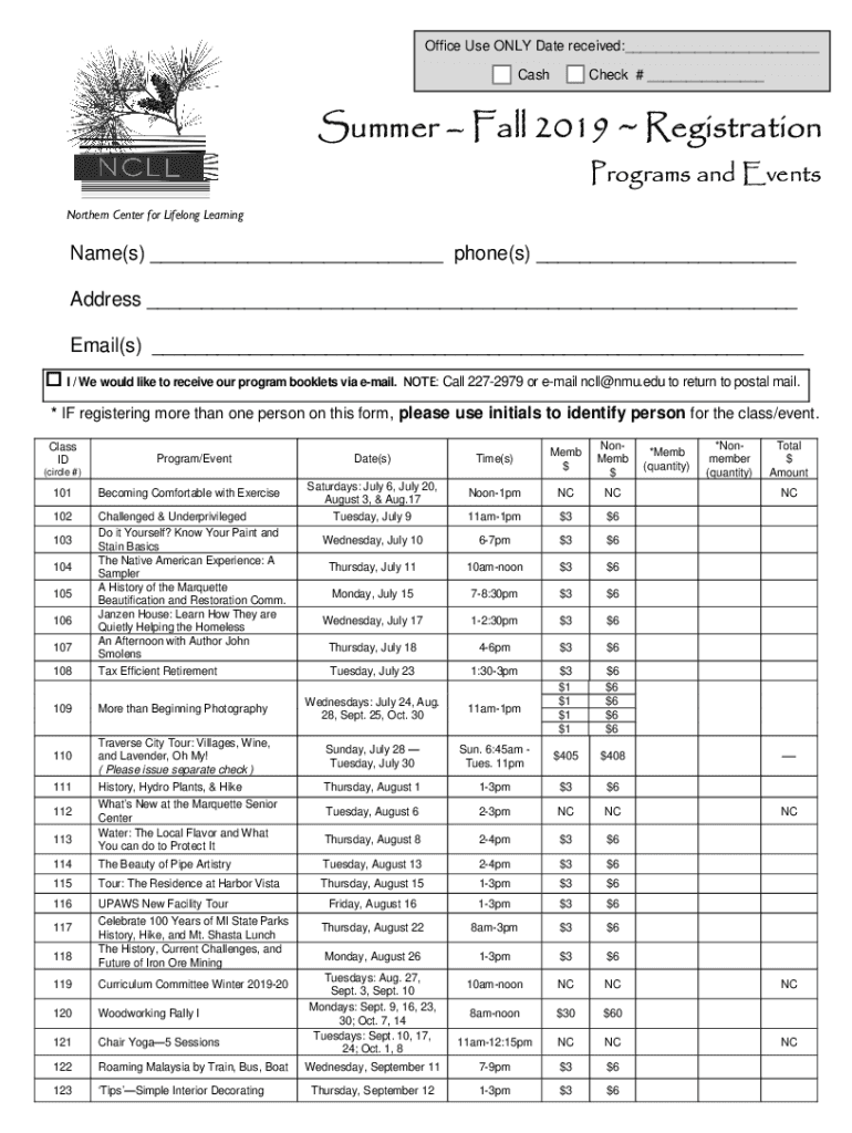 Paycheck # ___Summer Fall 2019 RegistrationPrograms and EventsNorthern Center for Lifelong LearningName(s) ___ phone(s) ___