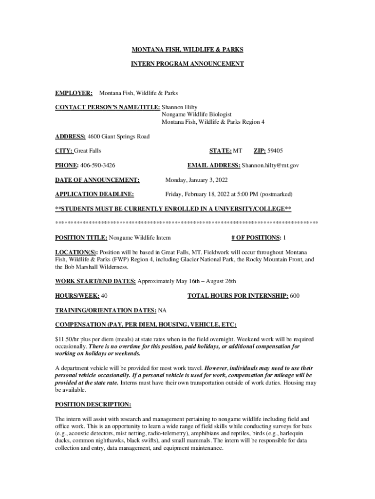 INTERN PROGRAM ANNOUNCEMENTEMPLOYER:Montana Fish, Wildlife & Precontact PERSONS NAME/TITLE: Shannon Hilly