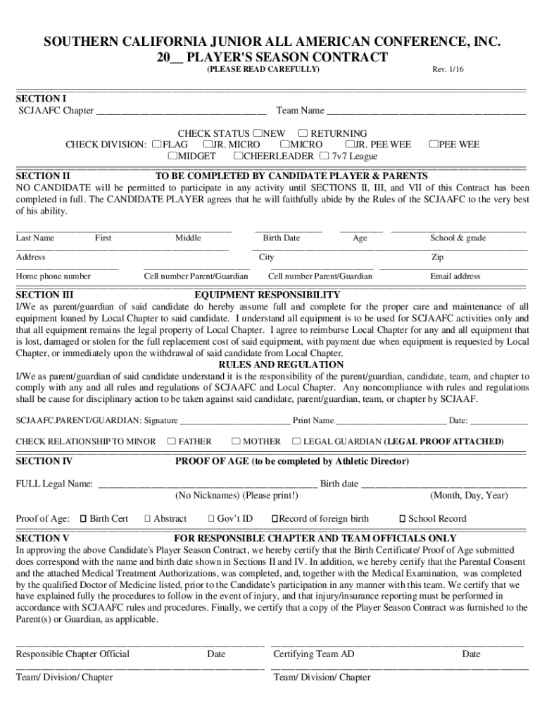 SOUTHERN CALIFORNIA JUNIOR ALL AMERICAN CONFERENCE, INC. 20__ PLAYER\'S SEASON CONTRACT (PLEASE READ CAREFULLY)Rev. 1/16___SECTION I SCARF Chapter ___ Team Name ___ CHECK STATUS NEW RETURNING CHECK