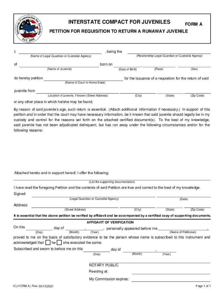 INTERSTATE COMPACT FOR JUVENILESFORM PETITION FOR REQUISITION TO RETURN A RUNAWAY JUVENILE, being the, (RelationshipLegal Guardian or Custodial Agency)(Name of Legal Guardian or Custodial Agency)Osborn