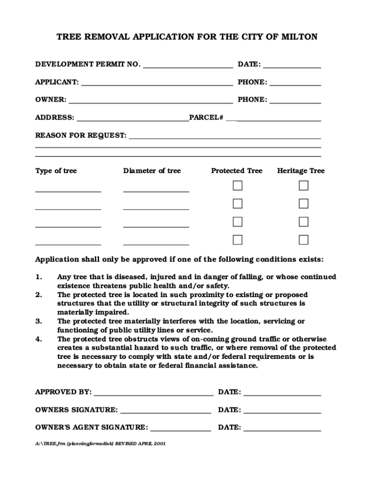 TREE REMOVAL APPLICATION FOR THE CITY OF MILTON DEVELOPMENT PERMIT NO.DATE:APPLICANT:PHONE:OWNER:PHONE:ADDRESS:PARCEL# ___REASON FOR REQUEST:Type of treeDiameter of overprotected TreeHeritage Reapplication