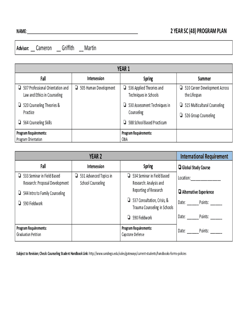 NAME: ___ Advisor: __ Cameron__ Griffith2 YEAR SC (48) PROGRAM PLAN__ Martin YEAR 1FallIntersession 507 Professional Orientation and Law and Ethics in Counseling 505 Human DevelopmentSpringSummer