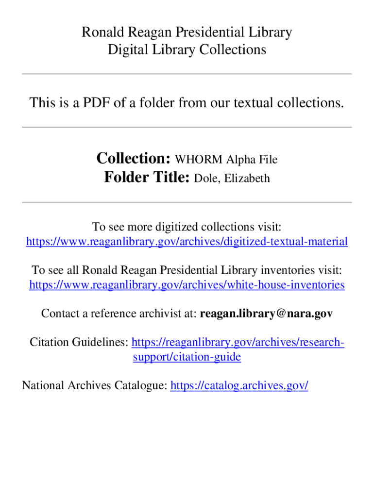 Ronald Reagan Presidential Library Digital Library CollectionsThis is a PDF of a folder from our textual collections. Collection: WHOM Alpha File Folder Title: Dole, Elizabeth To see more digitized