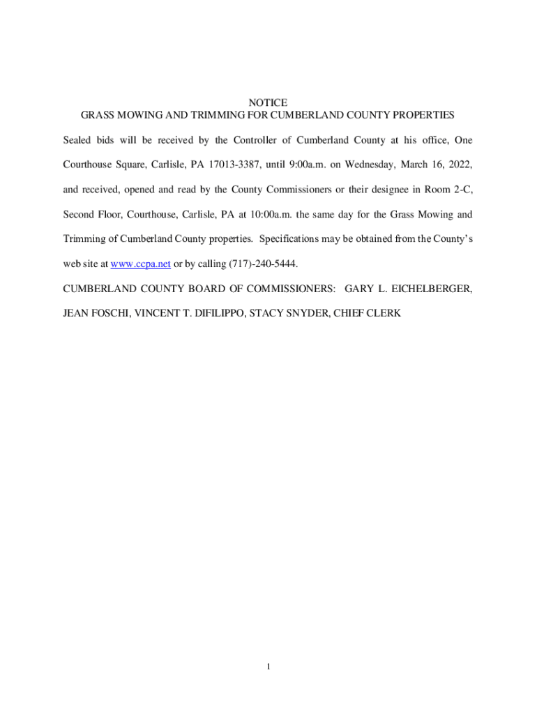 NOTICE GRASS MOWING AND TRIMMING FOR CUMBERLAND COUNTY PROPERTIES Sealed bids will be received by the Controller of Cumberland County at his office, One Courthouse Square, Carlisle, PA 170133387,