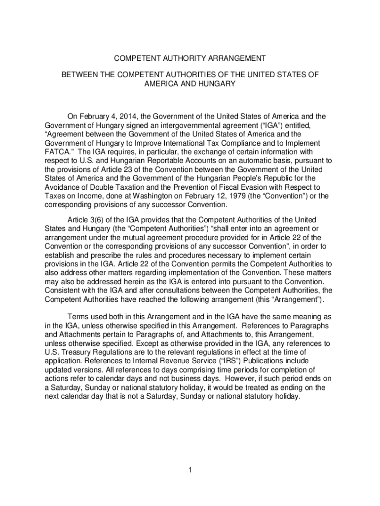 COMPETENT AUTHORITY ARRANGEMENT BETWEEN THE COMPETENT AUTHORITIES OF THE UNITED STATES OF AMERICA AND Hungarian February 4, 2014, the Government of the United States of America and the Government