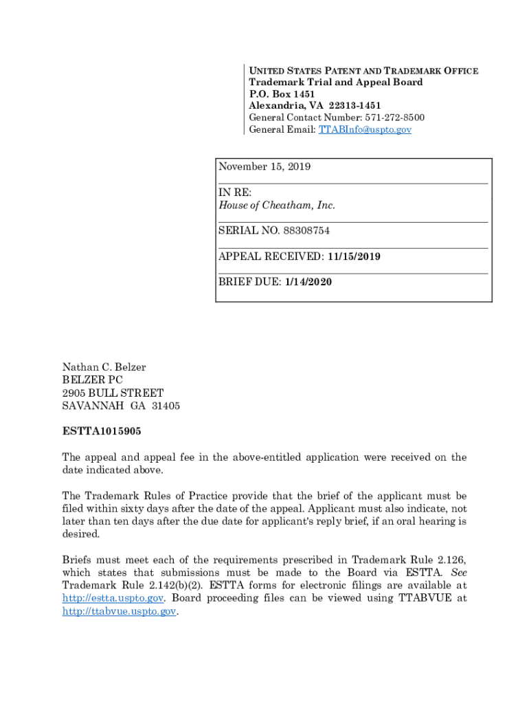 UNITED STATES PATENT AND TRADEMARK OFFICE Trademark Trial and Appeal Board P.O. Box 1451 Alexandria, VA 223131451 General Contact Number: 5712728500 General Email: TTABInfo@uspto.govNovember 15, 2019