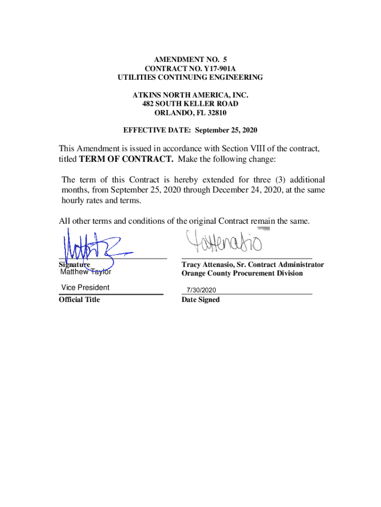 AMENDMENT NO. 5 CONTRACT NO. Y17901A UTILITIES CONTINUING ENGINEERING ATKINS NORTH AMERICA, INC. 482 SOUTH KELLER ROAD ORLANDO, FL 32810 EFFECTIVE DATE: September 25, 2020This Amendment is issued