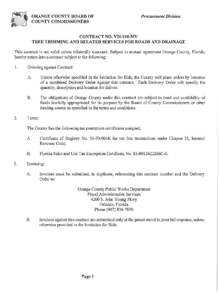 January 10, 2020, BOARD OF COUNTY COMMISSIONERS ORANGE COUNTY, FLORIDA INVITATION FOR BID (IF) Y20110; ADDENDUM # 1 TREE TRIMMING AND RELATED SERVICES FOR ROADS AND DRAINAGE This Addendum is hereby
