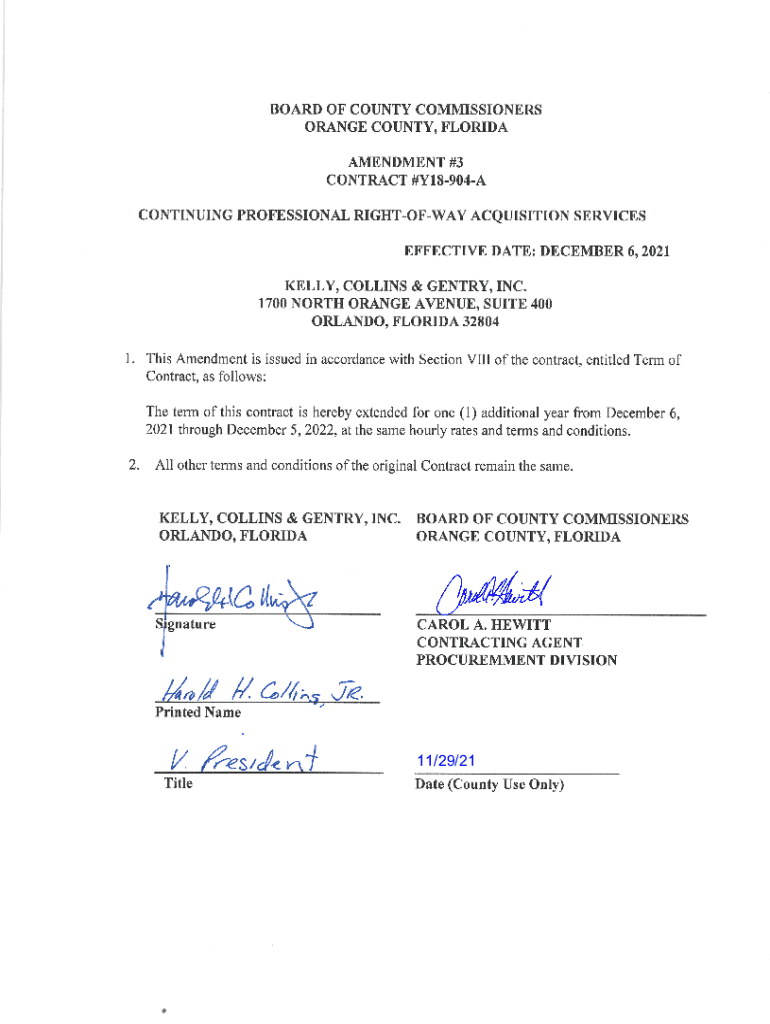 11/29/21BOARD OF COUNTY COMMISSIONERS ORANGE COUNTY, FLORIDA AMENDMENT #2 CONTRACT #Y18904A CONTINUING PROFESSIONAL RIGHTOFWAY ACQUISITION SERVICES EFFECTIVE DATE: DECEMBER 6, 2020, KELLY, COLLINS
