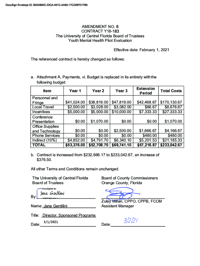 AMENDMENT NO. CONTRACT Y18The University of Central Florida Board of Trustees Youth Mental Health Pilot Evaluation Effective date: February 1, 2021, The referenced contract is hereby changed as follows:a.