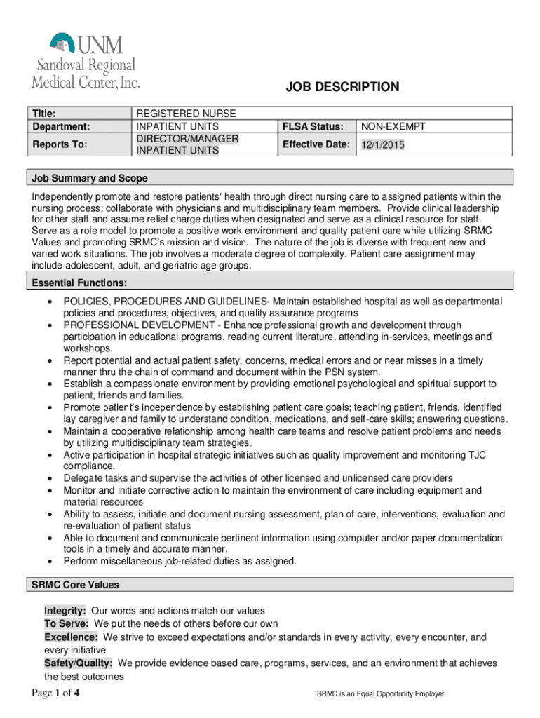 JOB DESCRIPTION Title: Department: Reports To:REGISTERED NURSE INPATIENT UNITS DIRECTOR/MANAGER INPATIENT UNITSFLSA Status:NONEXEMPTEffective Date:12/1/2015Job Summary and Scope Independently promote